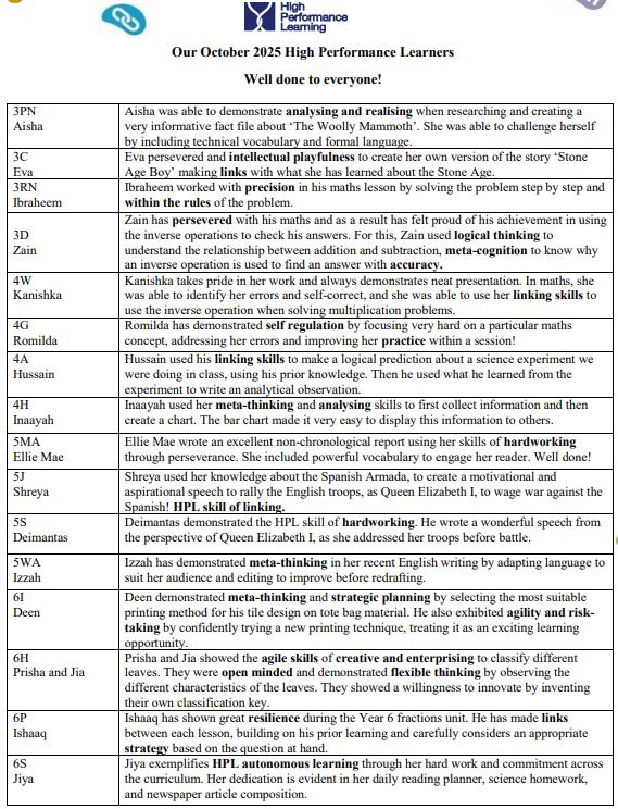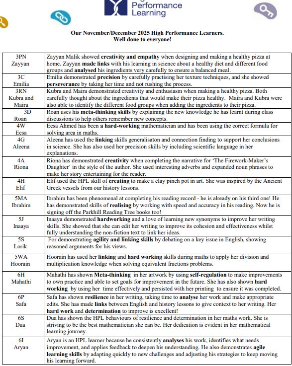 High Performance Work Mentioned in the Headteacher’s Newsletter